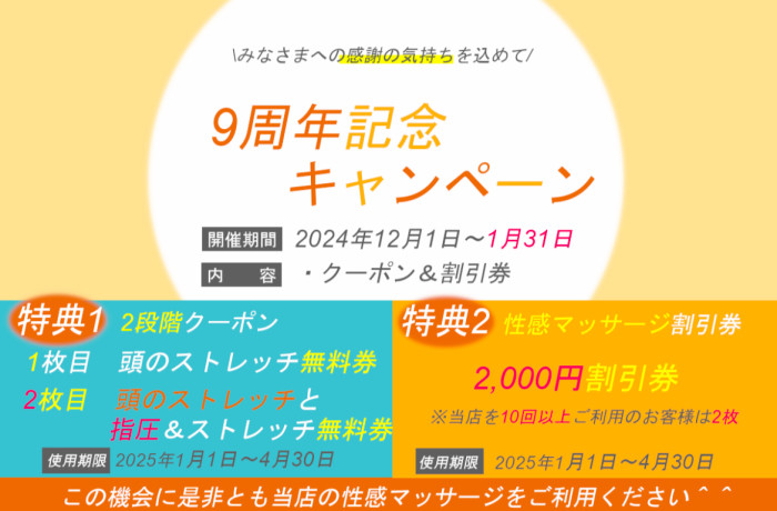 いつもリフレッシュサロンAngeをご愛顧頂きありがとうございます(^^) 9周年記念キャンペーンの期間延長のお知らせです。 ありがたいことにご好評につき、早い段階でキャンペーン期間中の予約枠が満了となりました。 そこでキャンペーン期間を「1月31日まで」に延長することにいたしました。 (来年は10周年ということですし^ ^) キャンペーン内容は以下の通りです。 【キャンペーン期間】 2024年12月1日〜1月31日 【特典①】2段階クーポン(各1枚) 期間中に当店をご利用のお客様全員に発行いたします。 ①頭のストレッチ無料券(計30分、3,000円分) ②指圧&ストレッチと頭のストレッチ無料券(計60分、6,000円分) ※クーポンの使用期限は2025年1月〜4月となります ※『①→②』の順番でご利用いただけます ※特典2性感エステ割引券との併用可能です 【特典②】性感エステ2,000円割引券1枚 期間中に当店をご利用のお客様全員にプレゼント。 ◯性感エステの2,000円割引券 ※割引券の使用期限は2025年1月〜4月となります。 ※当店を10回以上ご利用頂いているお客様→1枚→2枚 ※特典1のクーポン券との併用可能です 年に一度のキャンペーンとなります。 この機会に是非ともご利用くださいませ。