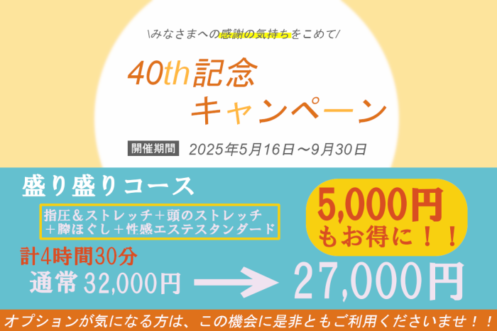 いつもリフレッシュサロンAngeをご愛顧頂きありがとうございます(^^) おかげさまで当店も40周年を迎えることができ…ではなく(°▽°) おかげさまで私しずくは地球に生まれて40年を迎えることができました⭐︎ ↑なんだそれ( ’-‘ )ノ)`-‘ )笑笑 そうです! 今年から新たなステージの始まりです(^-^)v 自分自身へのお祝いとお客様への感謝の気持ちを込めて!! ということで、謎のキャンペーンを実施いたします(^^) その名も「40th記念キャンペーン」 ↑(*’ω’ノノ゙☆パチパチ キャンペーン内容は以下の通りです。 【期間】 2025年5月11日〜2025年8月31日 【ご利用対象者】 全てのお客様が対象となります。(ご新規様、リピーター様) ※こちらのキャンペーンはお一人様一度のみとなります。 【内容】 盛り盛りコースをスペシャル価格でご案内いたします! 指圧&ストレッチ30分 頭のストレッチ30分 膣ほぐし30分 性感エステスタンダード180分 合計270分(4時間30分) 通常 通常32,000円のところ5,000円引きの27,000円に ※上記金額に交通費とお部屋利用料金がプラスされます。 ※他の割引券との併用は不可となります。 ※性感エステをじっくりプランに変更することが可能です。 →その場合は差額分の5,000円を追加した32,000円となります。 ※こちらのコースにオプションの添い寝セラピーやバーチャルSEXなどを追加することも可能です。 あのオプションってどんな感じかな?と気になっていた方は是非ともこの機会にご利用くださいませ。