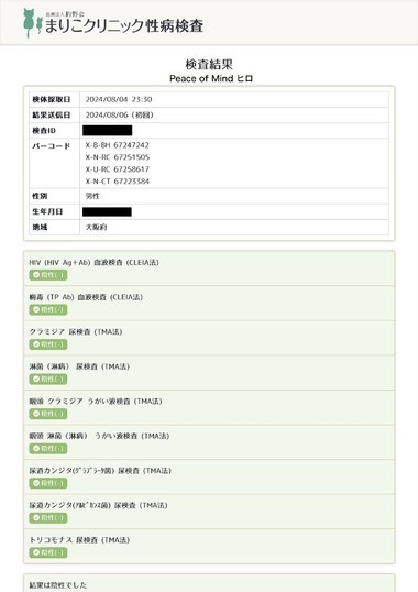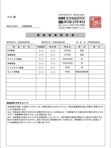 8月度の性病検査の結果異常ありませんでした??