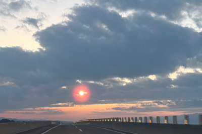 あちこち出かけた帰り道、車を走らせていると前方に沈みゆく夕日が目に入りました。雲の隙間から差す光と、茜色に染まる空。