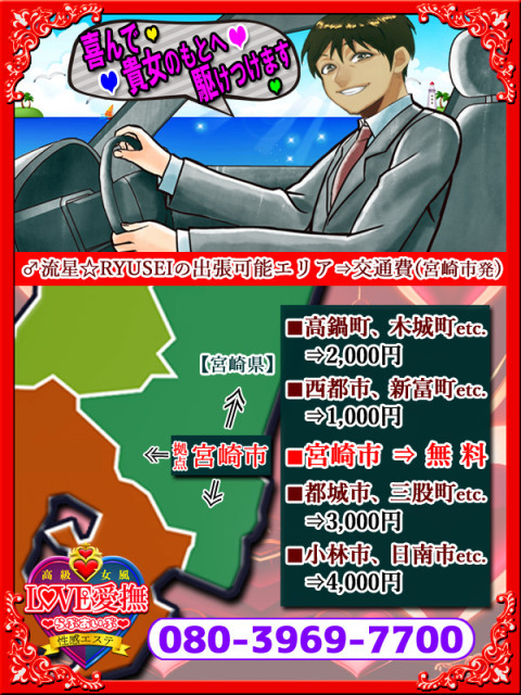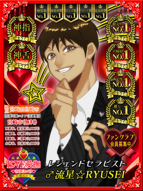 お客様と会った瞬間、パッチリ二重の超眼力でロックオンする漢♂流星。さらに、爽やかな笑顔と、優しい口調の低音ボイスから繰り広げられる「聞き上手♡褒め上手」の軽快なトークで場を和ませると、緊張されていたお客様は瞬時にアイスブレイク!安心感と開放感に包まれる。心を開いたお客様は、ワクワク感いっぱいでベッド上に大の字となり、まさに身をもってプロフェッショナルの世界を知ることになる。♂流星が独自に開発した「至福の性感エステコース」は、リラクゼーションの気持ち良さ+エロスの気持ち良さの融合で一石二鳥!女性に至れり尽くせりのスペシャルプログラム。信頼と実績のゴッドフィンガーから愛撫されるお客様は、新発見!新感覚!新刺激の連続。自然と溢れ出る喘ぎ声と大量のラブジュース(愛液)が止まらない。一味も二味も、プライベートの日常生活では経験したことがない快楽を味わい、自分自身が驚くくらいの「私」に出会うお客様。それは、普段、家庭や職場、彼氏や旦那の前ではなれない「私」。絶対に誰にも見せられない「私」であろう。なかには、普段、彼女として、嫁として、ママとして頑張り我慢するあまりに「私」の姿を見失っている女性もいるかもしれない。忘れていた何か・・・『女』であることを思い出すキッカケになるかもしれない。女性が、自分自身と向き合い、体はもちろん、心の奥底や脳内に至るまで、スッキリとリセット&リフレッシュできるサービスは他にない。もちろん、幸せホルモンが大量に分泌して、自分自身をアップデート出来る。異次元ともいえる女性経験数から得た漢♂流星の知識とテクニックは自他共に認める「本物」で、100%お客様に尽くす相手本位の施術を一度体験したお客様は、正直、日常生活に戻るのが嫌になることだろう。この快楽を一度知ると中毒性があるかもしれない。ただ、そこまでなるからこそ、女性がしっかりとお金を払ってまでしてサービスを受ける「女性用風俗店」の存在が現代社会には必要で、2020年3月3日(ひなまつり)にオープンした当店は、おかげさまでコロナ禍にも負けず、今もなお「信頼第一!」で営業を継続させていただいている。女性用風俗とは?性感エステとは?本当に女性の体と心を満足させる女風セラピストとは?そんな「イ・ロ・ハ」を知りたければ、是非一度、♂流星と会って、体を預けてみてください。「女性用風俗店の神髄は、神話のふるさと宮崎のココLOVE愛撫にあり。」♂流星をヨロシク(^^)/~~~