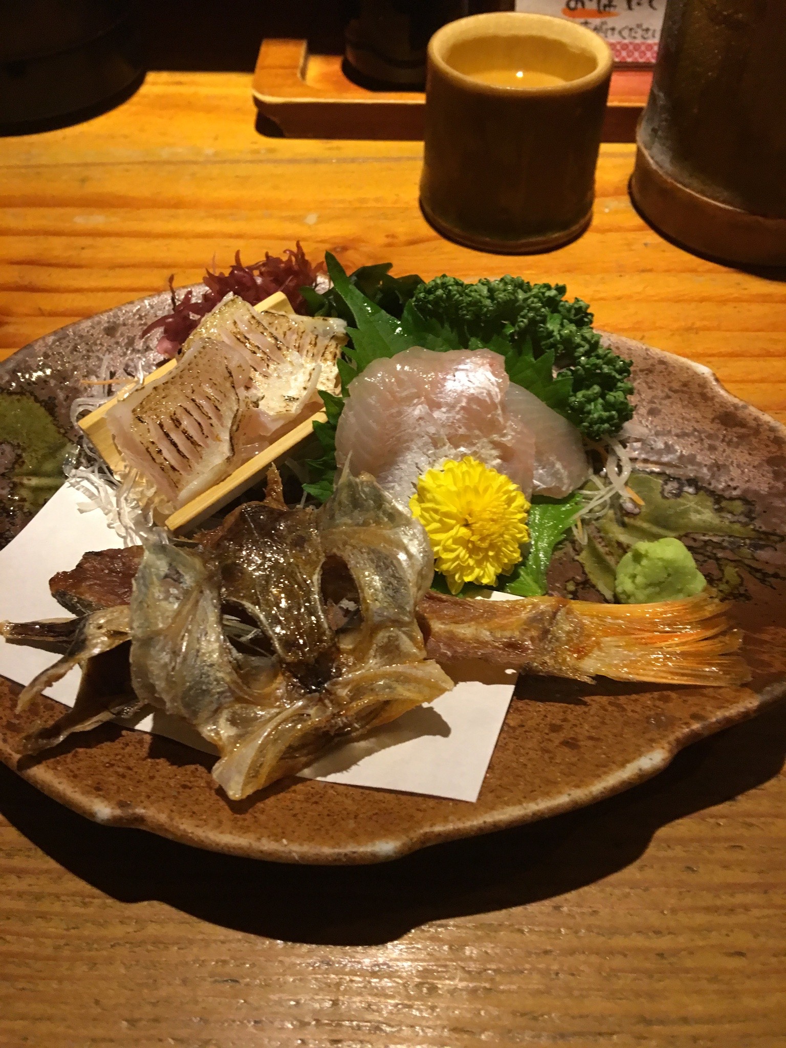 先ほどの神々しい竹日本酒が後ろに見えますね!! 僕の記憶が正しければこれは新潟で入った居酒屋さんの写真⭐︎ だからこのお魚も新潟で獲れたお魚かな? 尻尾が赤いからアジではないかな? 釣りが趣味なので…
