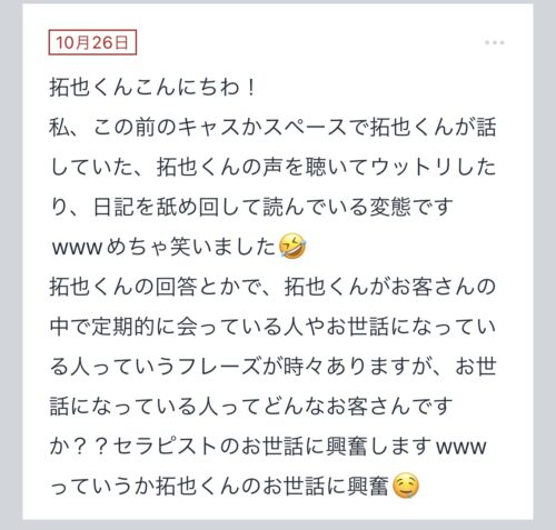 こんばんは〜!!拓也まんです! "拓也まんの!女風お悩み相談日記"のお時間です〜 kaikanセラピストランキング全国1位、セラピスト歴3年とそれなりにこの業界に携わらせて頂いてる…