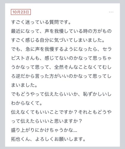 こんばんは〜!!拓也まんです! "拓也まんの!女風お悩み相談日記"のお時間です〜 kaikanセラピストランキング全国1位、セラピスト歴3年とそれなりにこの業界に携わらせて頂いてる拓…