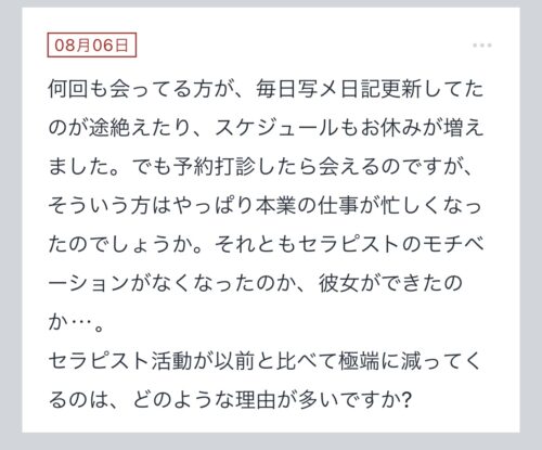 こんばんは〜!!拓也まんです! "拓也まんの!女風お悩み相談日記"のお時間です〜 kaikanセラピストランキング全国1位、セラピスト歴3年とそれなりにこの業界に携わらせて頂いてる拓…