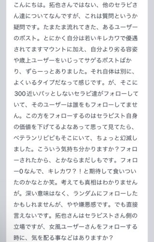 こんばんは〜!!拓也まんです! "拓也まんの!女風お悩み相談日記"のお時間です〜 kaikanセラピストランキング全国1位、セラピスト歴3年とそれなりにこの業界に携わらせて頂いてる拓…