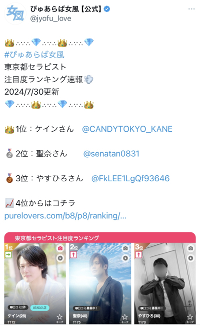 こんにちは〜!!拓也まんです! "拓也まんの!女風お悩み相談日記"のお時間です〜 kaikanセラピストランキング全国1位、セラピスト歴3年とそれなりにこの業界に携わらせて頂いてる拓…