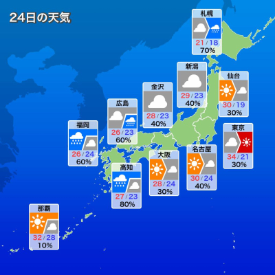 おはようございます 櫻井です^ ^ 6月24日 月曜日の今日は 東日本では前線の活動が弱まり 関東などは日差しが届く見込みです 内陸部では35℃以上の厳しい暑さが予想され…