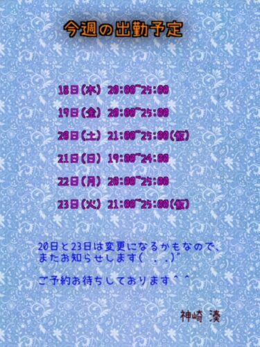 こんにちは☀️ 本日このあと14時から出勤です! 珍しい平日日中からの出勤なので普段お時間合わない方チャンスですよ〜🤩 ご予約お待ちしておりますっ!! 神崎 湊