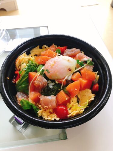 こんにちは!今日のお昼はポキ丼です。マグロとサーモンをごま油風味のタレで和えたものがご飯によくあっていて最高でした。おいしかった(^_^)