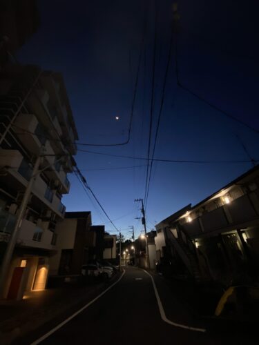 今日はとても朝?早く目が覚めて日の出前に愛犬の散歩に行った。最近は電線を埋めてる?らしい確かに景観がよくなるかもだけど電信柱と電線のある風景も割と好き。