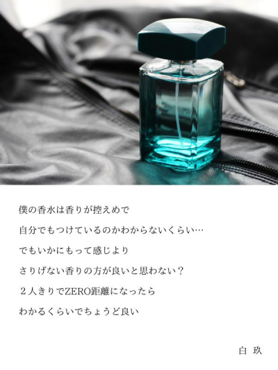 僕の香水は香りが控えめで 自分でもつけているのかわからないくらい… でもいかにもって感じより さりげない香りの方が良いと思わない? 2人きりでZERO距離になったら わか…