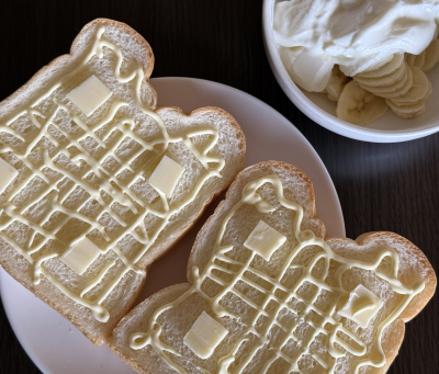 本業お休みなのに残念なお天気の朝は、申し訳程度の筋トレを言い訳に明らかに身体に悪そーなバタマヨ🍞でブランチ。 いろいろあって、焼きに失敗…😭 午後は気を取り直していこ♪