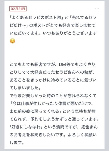 こんにちは〜!!拓也まんです! "拓也まんの!女風お悩み相談日記"のお時間です〜 kaikan、ぴゅあらばセラピストランキング全国1位、セラピスト歴5年目とそれなりにこの業界に携わ…