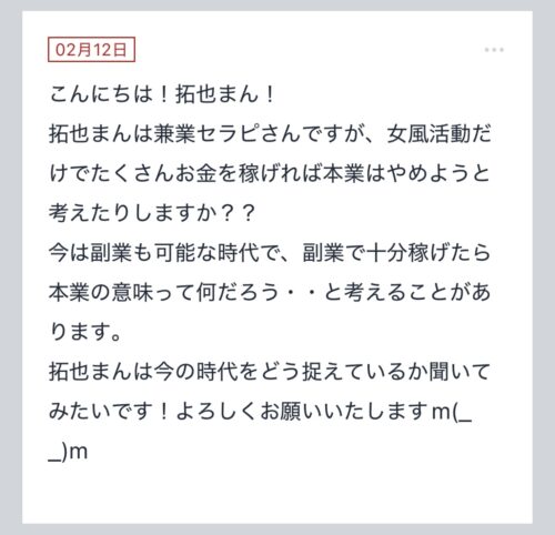 こんばんは〜!!拓也まんです! "拓也まんの!女風お悩み相談日記"のお時間です〜 kaikan、ぴゅあらばセラピストランキング全国1位、セラピスト歴5年目とそれなりにこの業界に携わ…