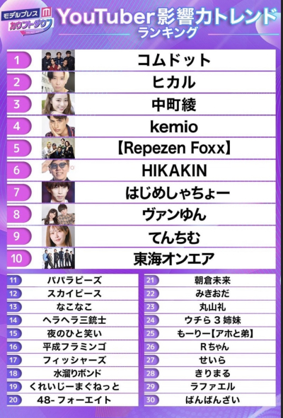 こちらYouTuber影響力トレンドランキングです!!