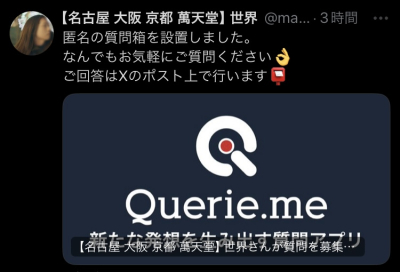 世界の皆さん、こんにちは🌏 質問箱を設置しました↓ querie.me/user/mantendot 匿名で僕は直接のご質問が可能です。 ご回答はXのポスト…