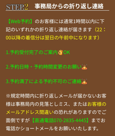 最近、ご新規のお客様より、事務局の営業時間外でのご予約を多く頂戴しております。そこで、ご予約に関するお知らせをさせていただきます。当店のWeb予約システムでは、22時以降に頂いたご予約につきまして、セラピストへの予約内容の通知が翌日10時以降となります。そのため、当日夜間にお伺いする事が難しくなっております。