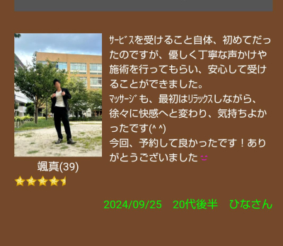 はねさん!指名頂きありがとうございました😌 こんな嬉しい口コミ、自分にはもったいないです💦 新人で、至らない点が多い自分だからこそ、気持ちだけはおろそかにしてはならないと思ってい…