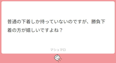 匿名でのご質問ありがとうございます。 他にも気になる事や知りたい事があればお気軽にマシュマロください。 【質問】普通の下着しか持っていないのですが、勝負下着の方が嬉しいですよね? …