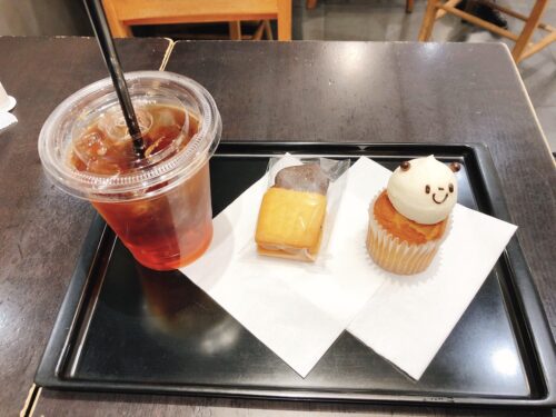 東京駅のカフェでパンダのカップケーキとレーズンサンドクッキーを食べてきました〜!あと、アイスティー。おいしかったです