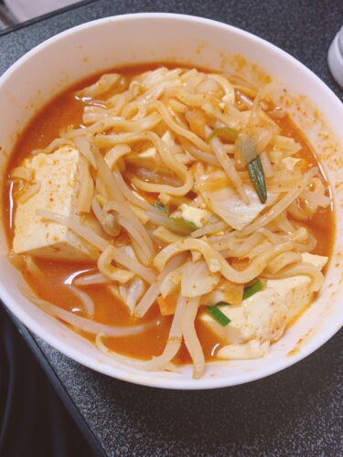 ちょっと前に袋麺を、アレンジしてスンドゥブ風激辛ラーメンにしてみました!辛いだけじゃないからちゃんと食べれました笑