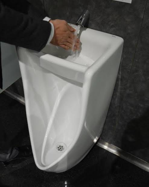 お手洗いに入ると初めて見る光景にビックリ!各小便器に手洗い場が付いてる見た事ないやつ!笑