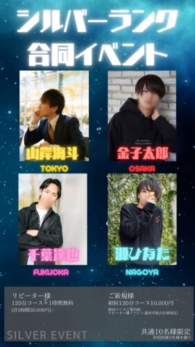 お久しぶりの写メ日記です。太郎です!今回はシルバー合同イベントについてです。☆概要・新規様120分コース1万円・リピーター様120分コース+1時間無料 計3時間を2万円☆人数制限・共通10名…
