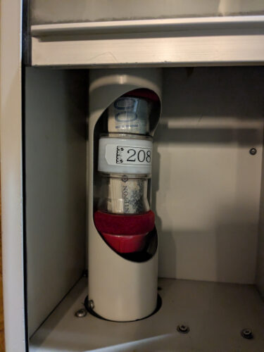 写真のような筒にお金を入れてボタンを押すと、風圧でシュパッと飛んで行きます。