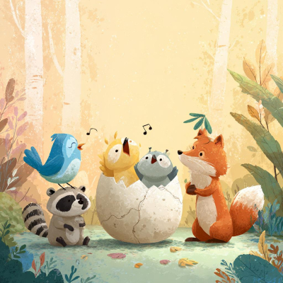 アライグマが手を森に流れる川で洗ってて、キツネの頭に葉っぱが付いてるのが見えてきます。ファンタジー感!!