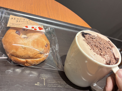 『カカオムースラテ☕️』と 『ストロベリークランベリーベーグルサンド🥯』で 心落ち着くひとときを🍀