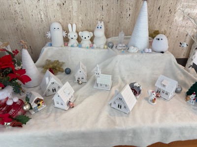 白い綿の雪の上に、ちょこんと並ぶ小さなお家やキャラクターたち。