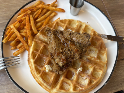 ワッフルの上にフライドチキンが乗っていて、