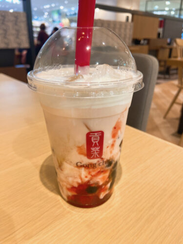ゴンチャのいちご杏仁豆腐ミルクティーを飲みました♪