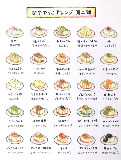 半分くらいは試したのですが、おすすめは「わさび+めんつゆ」 「アボカド+納豆+キムチ」「塩+オリーブオイル」「刻みトマト+ツナ」。