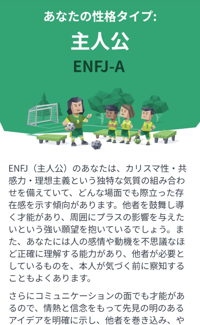 前に性格診断をしたのは、もう1年以上前。 最近の自分はどうかな…と思って、改めて受けてみました👀 結果は変わらず 主人公(ENFJ-A) でした✨ ・心を開く空間づくり ・調和の維持 …
