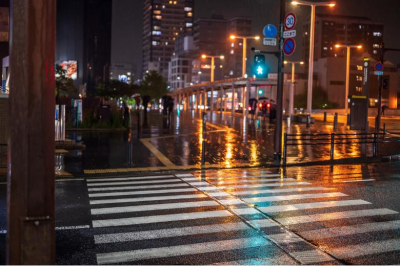 風に揺れる帽子と音符が浮かぶ夜の街と、雨でぼやける硝子のネオン