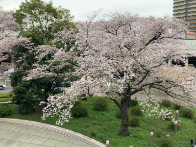 武蔵浦和の駅前の桜 緑とのコンストラストが映える 少し上から眺める桜 物事もいろんな角度から見ることで、 感受性も豊かになる