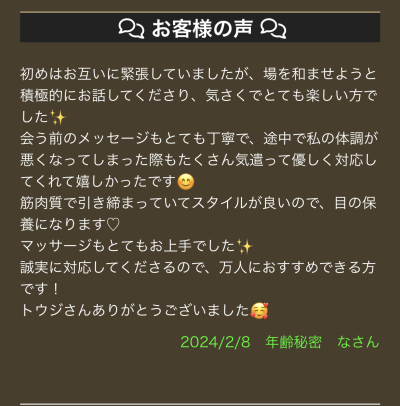 先日ご指名いただいたお客様よりレビューをいただきました‼︎ 初めてのレビューで嬉しいので日記でもお返事を😊 実は指名自体が1月25日にデビューしてから初めてでした。 ですのでお会いし…