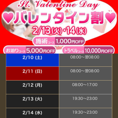 萬天堂イベント・バレンタイン割 2/13(火)・14(水)限定の2日間は、両日とも夜に出勤します🥰 冬の寒さを吹き飛ばし、甘い夜をわたしと一緒に過ごしませんか❤️ 日時等ご…