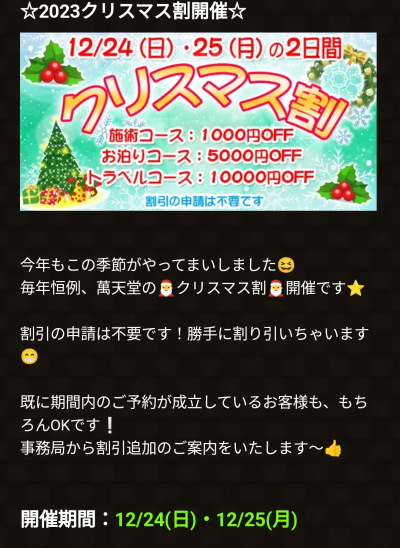 クリスマス割🈹が発表されました🎄✨ 残念ながら25㈪は参加出来ませんが、 24㈰は、終日勤務しておりますので 気になった貴女は、お早めにご予約 くださいね🥰 (先着1名) …