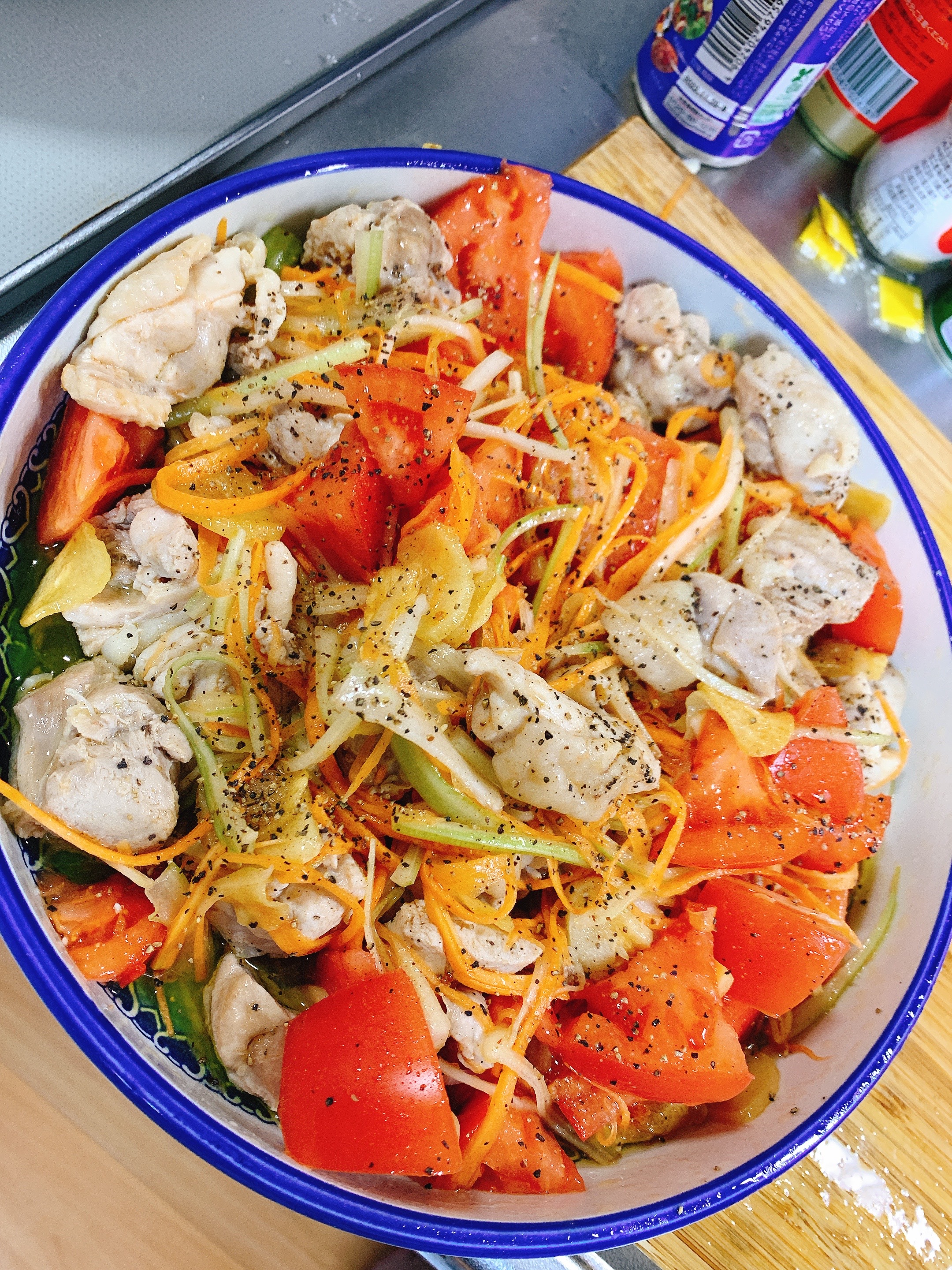 はい!お次!!蒸し鶏の根菜和え〜💓野菜たくさん取れるし食欲のない夏にはピッタリ!これまた味付けが酸味ありでビールによく合う1品でして(*´∇`*)