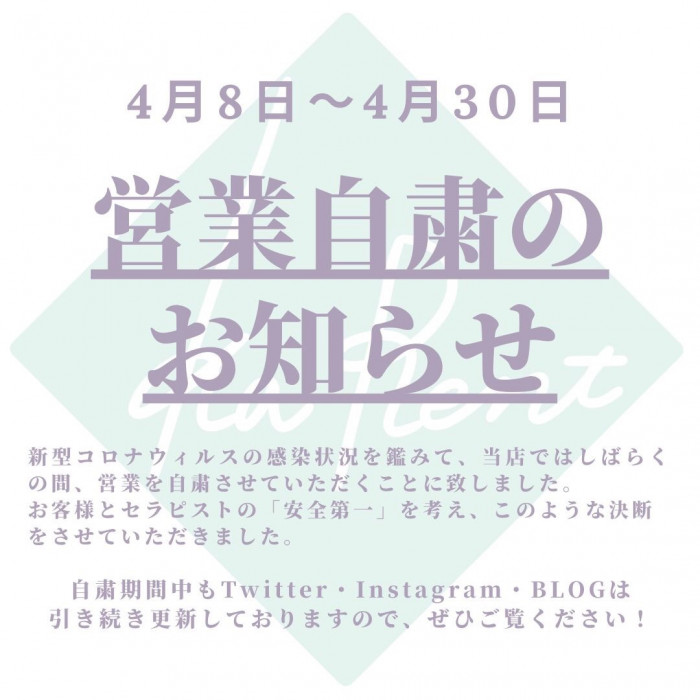 命に関わる可能性もあるウイルスをお客様へ感染させてしまうリスクもある中、お客様とセラピストの「安全第一」のため、このような決断をさせていただきました。