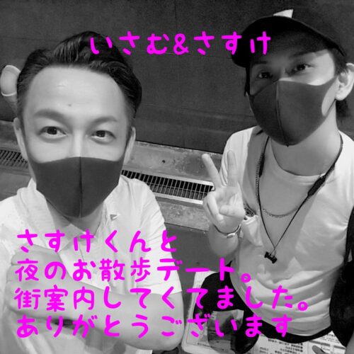 皆さん、こんにちは。 こんばんはの方はこんばんは。 ボーイズパラダイスの 「いさむ」です。 さすけくんと夜のランデヴー。 お仕事終わりで疲れている中、 街案内。 タフさ以上に面倒見が良い。 …