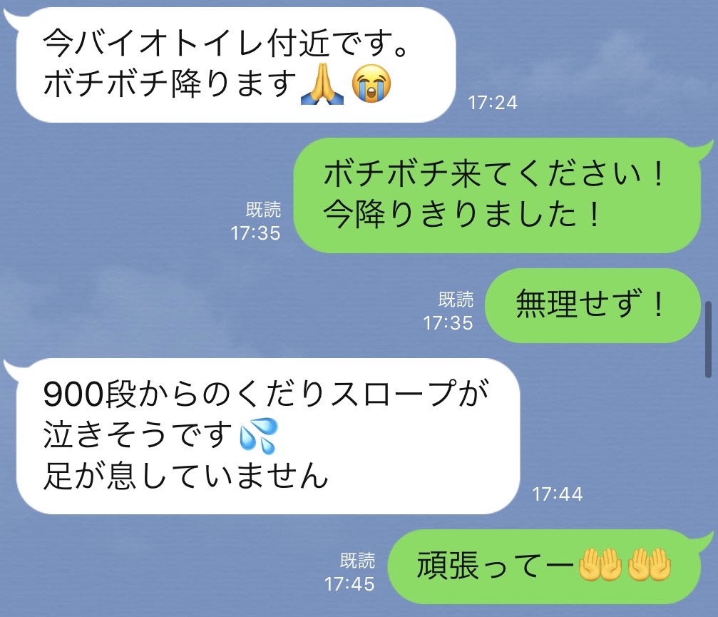 蓮くんと歩くんがちょっと先に居たので、まずは追いつこうと思い飛ばして下るがなかなか差が縮まらない。追いついたり追い抜かれたりしながら、みんな足がプルプルして膝に手をついて苦しんでいる僕も同様な状態だったけど、動画の使命感に燃え無理をしながら飛ばす「止まらなーい!あぁ”〜ツライ〜」登りより圧倒的なハイペースにより店長を除く3人は40分程でゴール!そして倒れ込む!そして店長は今どこだろう?こうして店長はなんだかんだ頑張って30分遅れで無事に降りて来ました。