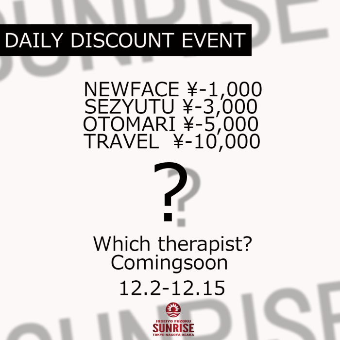 対象セラピストは以下のコースの割引が適用されます。NEWFACE料金 1,000円引き(名古屋店新人のみ)