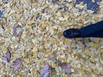 京平です。駅まで歩く道のイチョウの木が葉っぱが散っていました。