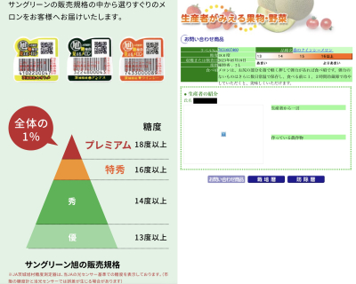 メロンに貼られたシールのQRコードを携帯で読み取りますと、品種、等級、検査日、糖度、そして、誰が(生産者名)どのように(農薬散布・施肥情報等)作ったかなどの生産履歴が見られるようです。