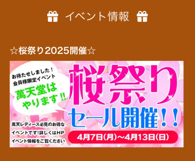 みなさんこんにちは😆 先日の雨と風で桜もだいぶ散ってしまいましたね💦 みなさんお花見楽しめましたか? 萬天堂の桜祭りは明日で最終日となりますが、あまり多く出勤できなくてすみ…