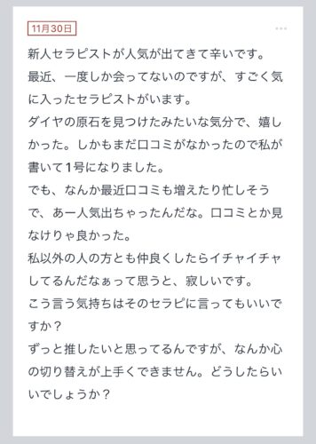【新人セラピストが人気が出てきて辛いです。】